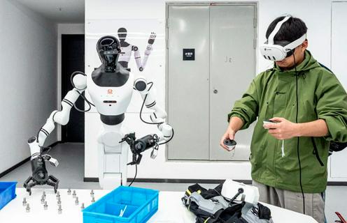中心现有110名员工,其中多数为«00后»。训练采用«小班制»,每台机器人配备两名人类教练,单个场景训练周期通常需7-8天。教练团队通过VR头显与手持控制器进行远程引导,例如指导机器人将保护膜装入包装盒,计算机终端同步记录操作数据。教练间会互换角色以确保动作精准度。